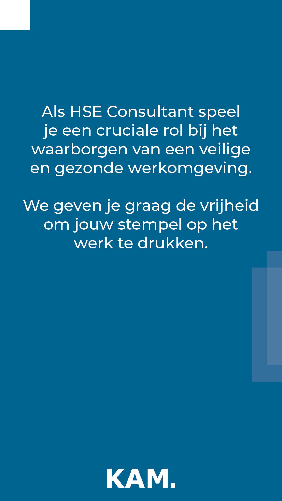 Het werk van een KAM Consultant (Kwaliteit, Arbo en Milieu) wordt vaak gezien als een 'stoffig' beroep. Terwijl het werk van een KAM Consultant niet alleen veel uitdagingen biedt, maar ook veel flexibiliteit. Om dit op een authentieke manier te vertellen hebben we onder andere diverse medewerkers aan het woord gelaten en dit gecombineerd met een meer objectieve selectieprocedure die door kandidaten als zeer postief wordt beoordeeld.