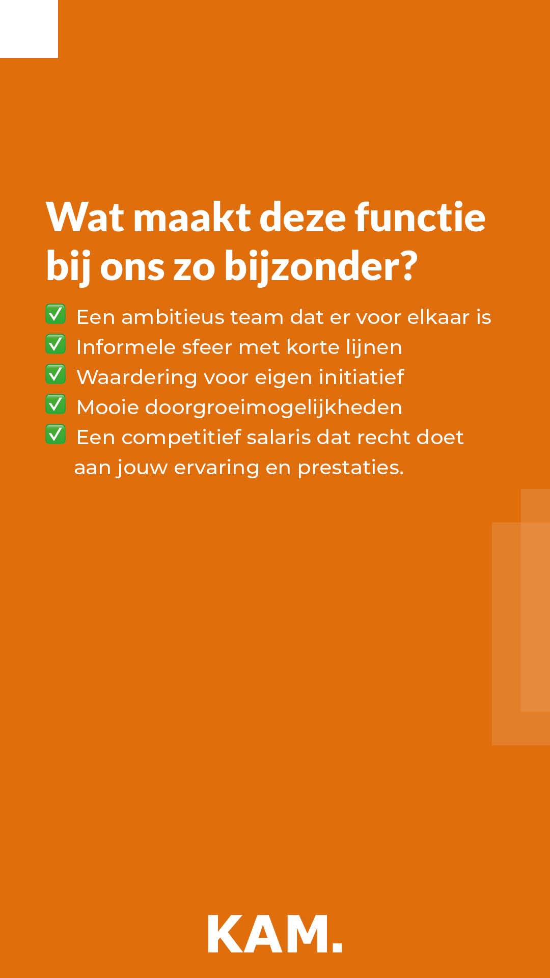 Een van de eerste uitdagingen was het stoffige imago dat het werk van een KAM-consultant met zich meedraagt. Certificering, kwaliteitssystemen en audits klinken nu eenmaal niet sexy. Om dit effectief aan te pakken, hebben we ingezet op authentieke employment branding waarbij we huidige werknemers zelf aan het woord lieten. Door hun verhalen, energie en dagelijkse werkzaamheden te laten zien, konden we het werkelijke gezicht van KAM Groep tonen: werk dat niet alleen uitdagend is maar ook flexibel in te delen.