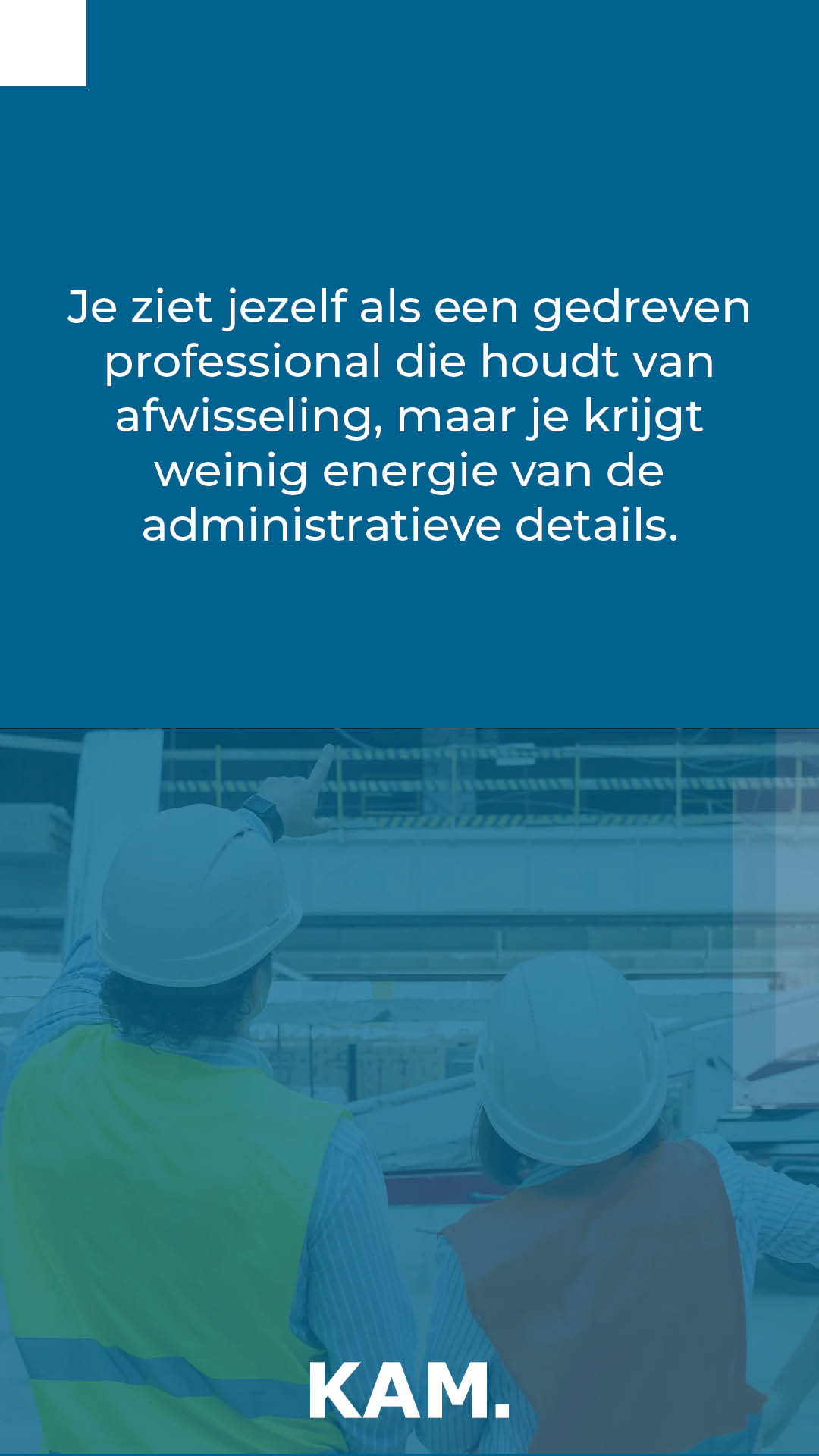 Personeelsbehoeften veranderen. De arbeidsmarkt verschuift. Daarom bleven we niet stilzitten. In nauwe samenwerking met KAM Groep hebben we de campagne aangepast op basis van nieuwe inzichten en feedback. Zo bleef de aanpak effectief, hoe de markt ook bewoog.